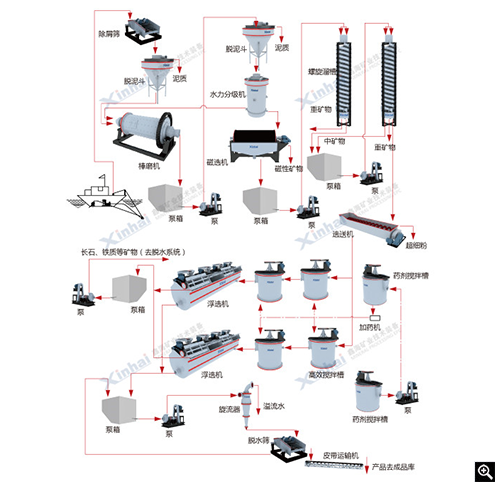 針對礦物磁性強弱特點,鑫海推出不同磁選法以處理不同磁性強度的礦物。弱磁場磁選法主要用于回收強磁性礦物; 強磁場磁選法應用于回收弱磁性礦物。