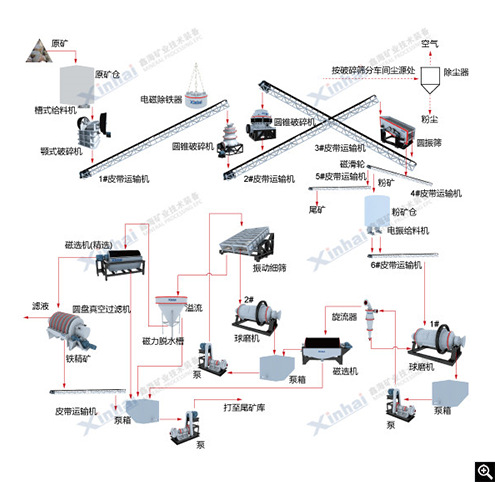 鑫海在對該項目鐵礦進行選礦試驗后,根據礦石性質特點,決定采用鑫海三段開路破碎,一粗、一精、一掃的磁選流程。原礦經過破碎磨礦后,磨礦產物返回分級機,構成一次閉路循環,粗粒中礦返回閉路循環,細粒返回原作業。之后分別采用鑫海永磁筒式磁選機進行一次粗選,一次精選以及一次掃選磁選作業,最終獲得合格的鐵精礦。