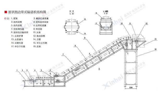 大傾角波狀擋邊帶式輸送機結構是在平行橡膠運輸帶兩側粘上可自由伸縮的橡膠波形立式"裙邊",在裙邊之間又粘有一定強度和彈性的橫隔板組成匣形斗,使物料在斗中進行連續輸送。