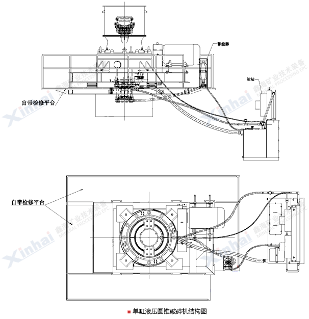 采用液壓調(diào)整排礦口,可及時(shí)、方便的調(diào)整排礦口,使破碎機(jī)在擠滿給料狀態(tài)下工作,降低易損件的消耗,降低運(yùn)營成本;