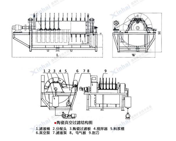 陶瓷真空過濾機主要由輥筒系統、攪拌系統、給排礦系統、真空系 統、濾液排放系統、刮料系統、發沖洗系統、聯合清洗(超聲波清洗、自動配酸清洗)系統、全自動控制系統、槽體、機架幾部分組成。