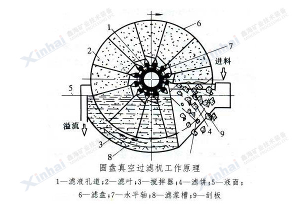 圓盤(pán)真空過(guò)濾機(jī)的過(guò)濾圓盤(pán)在礦漿槽中緩慢轉(zhuǎn)動(dòng),借助真空泵形成的壓力差,使固體顆粒吸附在圓盤(pán)的濾布上,形成一定厚度的濾餅。濾液透過(guò)濾餅和濾布從中心軸排除,濾餅在刮刀和鼓風(fēng)機(jī)產(chǎn)生的壓力風(fēng)作用下,掉進(jìn)卸濾餅槽中。