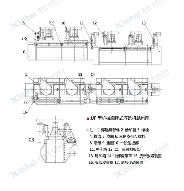 可與SF型浮選機(jī)構(gòu)成聯(lián)合浮選機(jī)組,SF型浮選機(jī)作吸入槽,JJF型作直流槽。