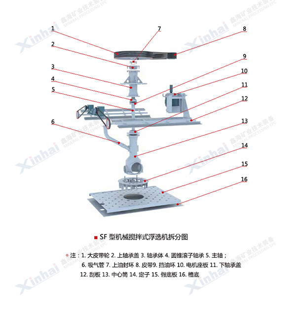 sf浮選機結構,主要由槽體、裝有葉輪的主要部件、電機、刮板以及傳動裝置等組成,它的容積大于10m3。