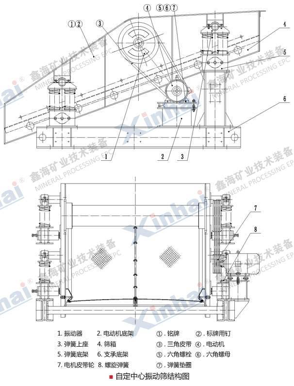 自定中心振動(dòng)篩原理是利用電機(jī)帶動(dòng)皮帶輪的主軸承時(shí),所產(chǎn)生的離心慣性力加在篩箱振動(dòng)系統(tǒng)的內(nèi)力、帶動(dòng)篩箱系統(tǒng)的重心做圓運(yùn)動(dòng)。偏重輪上偏心重塊的質(zhì)量,應(yīng)該保證它們所產(chǎn)生的離心慣性力能夠平衡篩箱旋轉(zhuǎn)時(shí)所產(chǎn)生的離心慣性力。使皮帶輪中心在空間不發(fā)生位移的條件是篩箱旋轉(zhuǎn)產(chǎn)生的離心慣性與偏心重塊產(chǎn)生的離心慣性力大小相等,方向相反,此時(shí)達(dá)到動(dòng)力平衡。 從而實(shí)現(xiàn)皮帶輪"自定中心",使得大小兩皮帶輪的中心距保持不變,消除了皮帶時(shí)松時(shí)緊的現(xiàn)象。