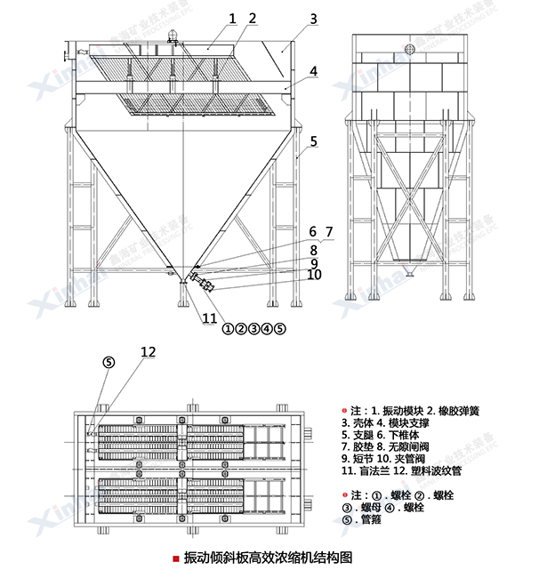 濃縮機整機包括上部箱體和下部錐體。上部箱體內有斜置的斜板組群,斜板組群由若干個相互獨立的斜板單元構成,處理物料由斜板單元下端兩側進入,斜板組群上方有一貫通全長的溢流槽,槽底開有節流孔,造成外排溢流的水力背壓,保證各斜板單元載荷均勻,防止徑向紊流。側向半逆流的給料方式,能使下沉的固體顆粒、上行的澄清液各行其道,互不干擾,沿斜板下滑的濃泥進入下部錐體后,壓縮脫水,并靠重力外排,亦可借助于機械振動使濃泥順利外排。