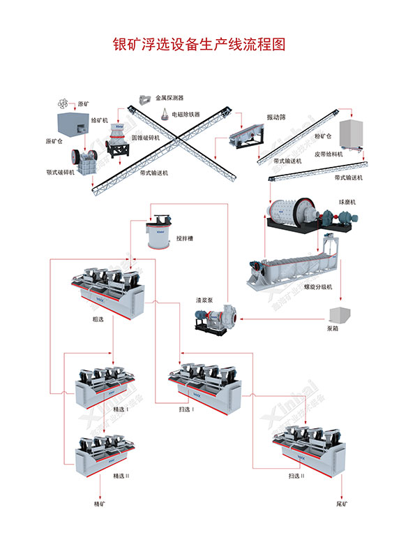 鑫海的銀礦浮選生產線主要由浮選機、浸出攪拌槽、鋅粉置換裝置、二層(三層)洗滌濃密機等組成。該生產線具有高效、低能、處理量高、經濟合理等優點。