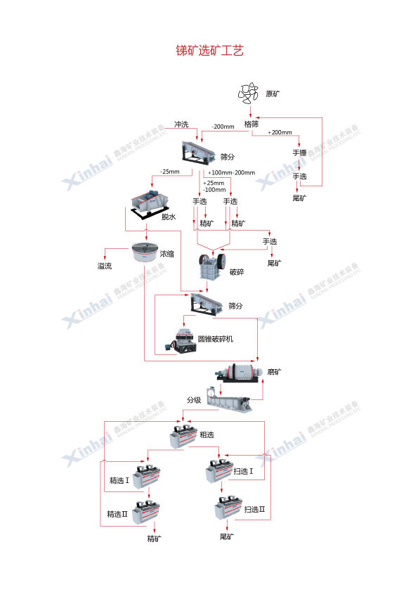 【工藝介紹】:銻礦的比重遠(yuǎn)大于脈石比重,通過(guò)重選的方法分選,重選法具有高效,節(jié)能,環(huán)保等特點(diǎn),還能夠使低品位礦石預(yù)先富集,重選后的銻礦再用浮選的方法加以提純。因此鑫海對(duì)銻礦選礦通常采用重選浮選聯(lián)合工藝。