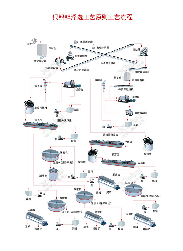 【工藝介紹】:銅鉛鋅選礦工藝流程采用混合浮選-精礦再磨流程,可以降低磨礦成本 ,并且易于管理,同時應用新型無毒浮選藥劑,高效、環保。